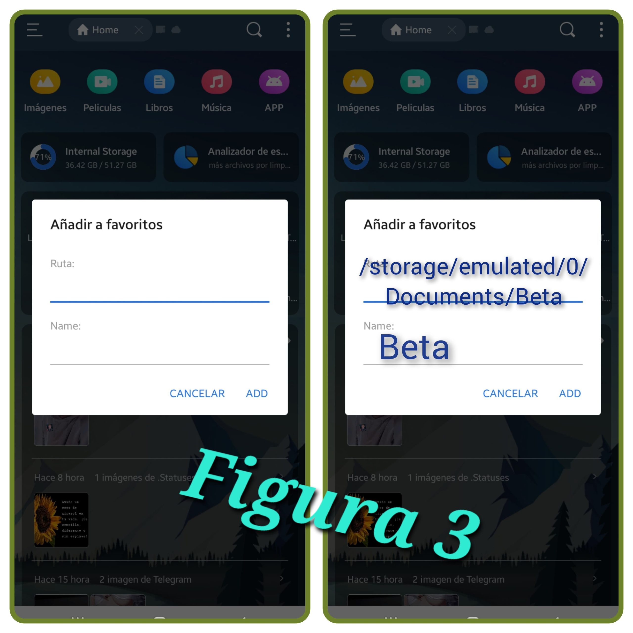 Selecionamos Favorito añadimos (add) una carpeta con la siguiente dirección /storage/emulated/0/»nombre de la carpeta aqui»