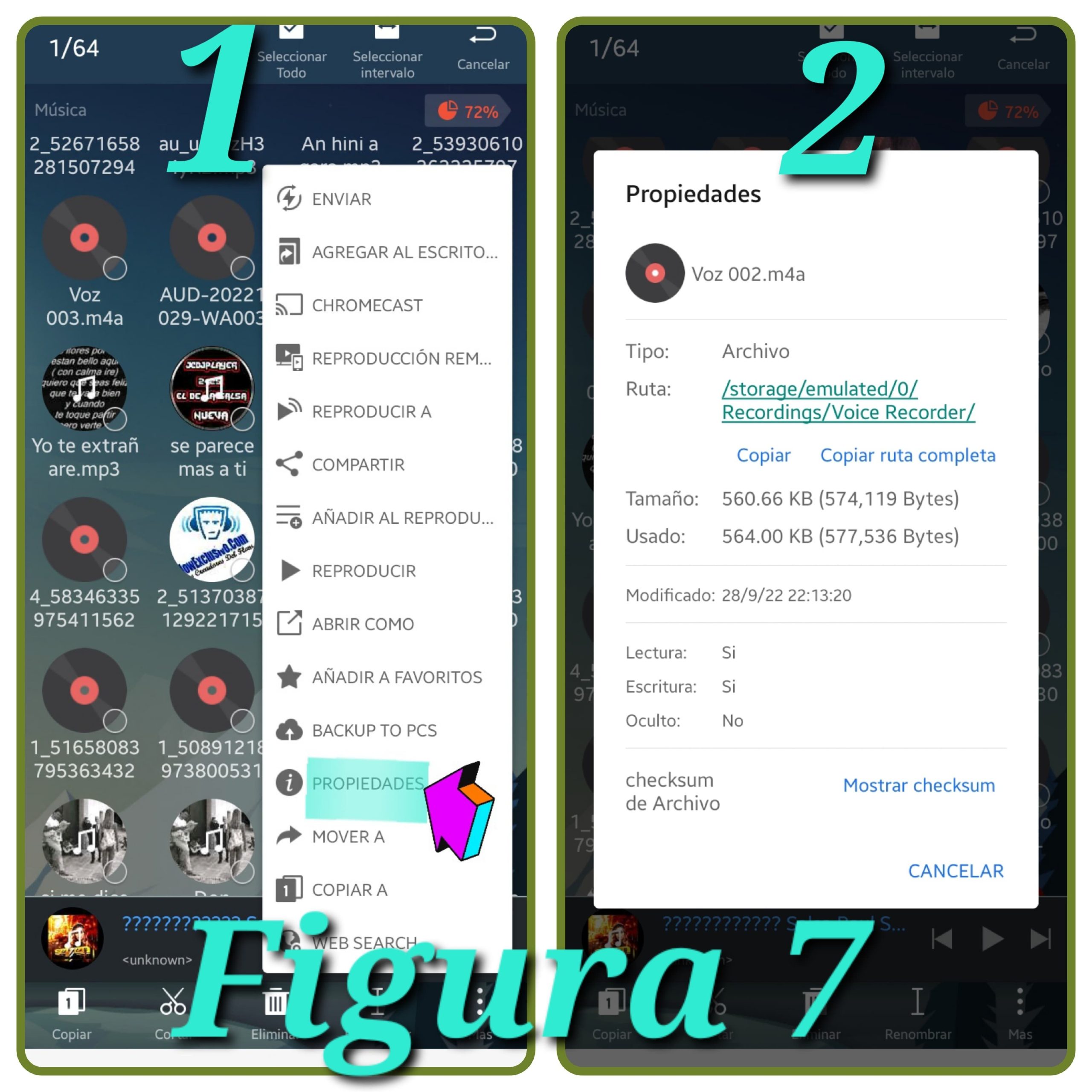 digamos, que usted desea tener sus músicas en un solo lugar, con tan solo un simple corte y pega resolverá el inconveniente. diríjase al menú del Explore, elija una de sus Músicas, como lo demuestra la imágenes, al tocar la música de su elección, en la parte inferior como lo demuestra la figura hay tres puntos verticales donde dice «más» presione ahí y busqué «Propiedades» según figura.