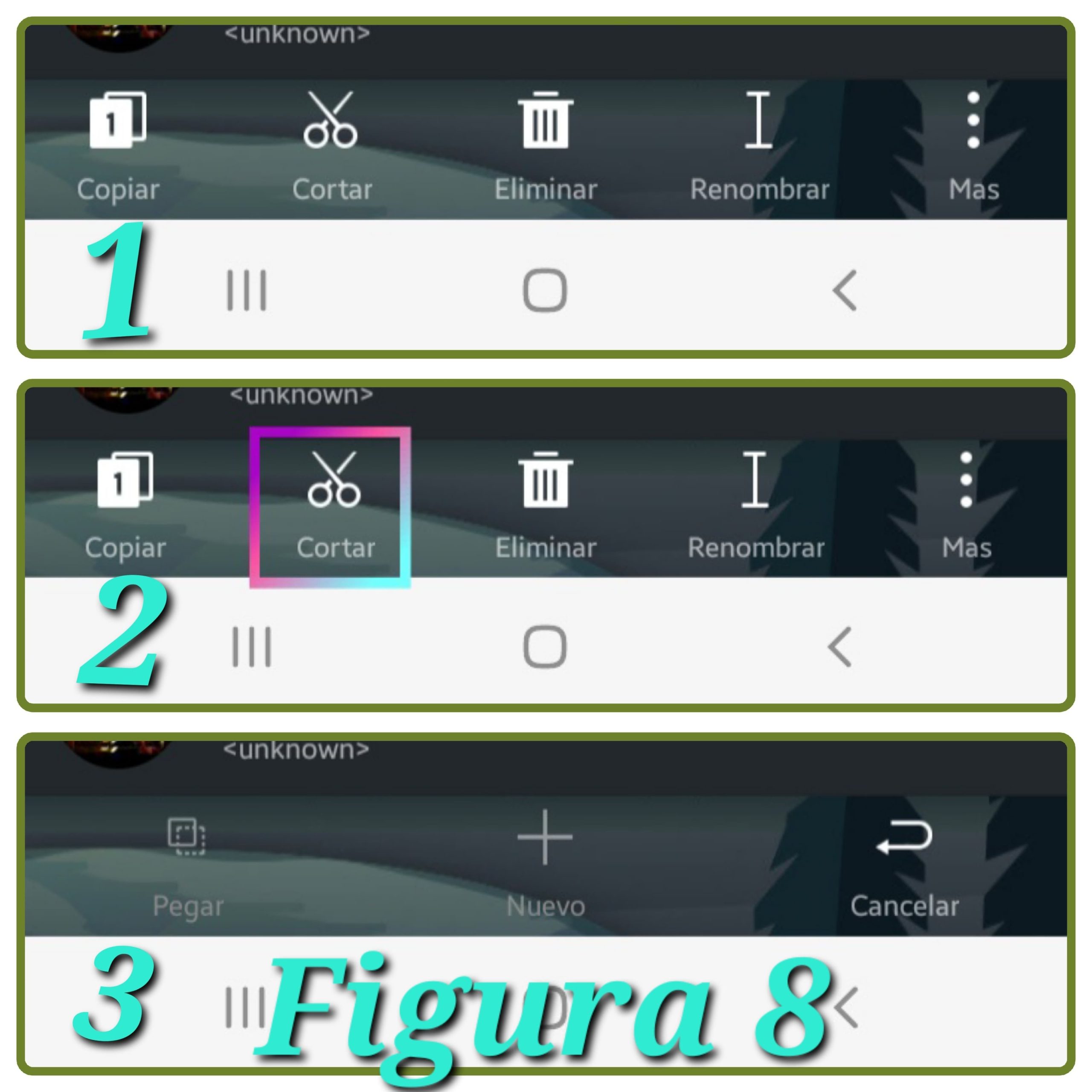 En la tercera imagen de la figura n° 8 aparecerá pegar, nuevo, y Cancelar. Ahora bien elija el menú del explorador y seleccione la 🗂 carpeta musica, y pegue. Y el problema estará resuelto. Así hará con las imagen, libros etc.